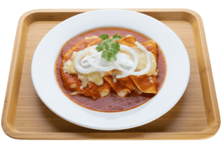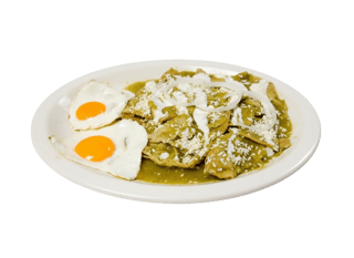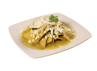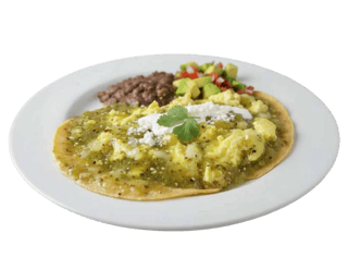 (Salsa verode o roja) Servido con Frijoles, Cebolla, Crema y Queso Cotija. / Served with Beans, Onions, Sour Cream & Cotija Cheese.