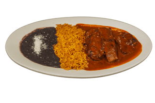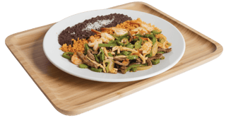 Servido con Arroz, frijoles y tortillas de maíz / Served with rice, Beans & Corn tortillas.