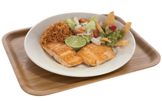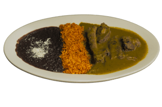 Servido con arroz, frijoles y tortillas de maíz / Served with rice, beans & corn tortillas.