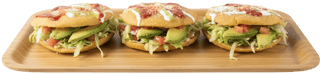Servido con Quesillo, Frijoles, Lechuga, Jitomate, Cebolla, Aguacate, Mayonesa, Chiles en vinagre. / Served with Quesillo, Beans, Lettuce, Tomatoes, Onions, Avocado, Mayo, Chiles en vinagre.