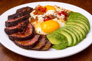 Crispy tortillas stuffed with mozzarella cheese, smothered in ranchero pinto beans and roasted tomato salsa, topped with two sunny-side-up eggs and queso fresco. Served alongside petite tenderloin steak and sliced avocado.